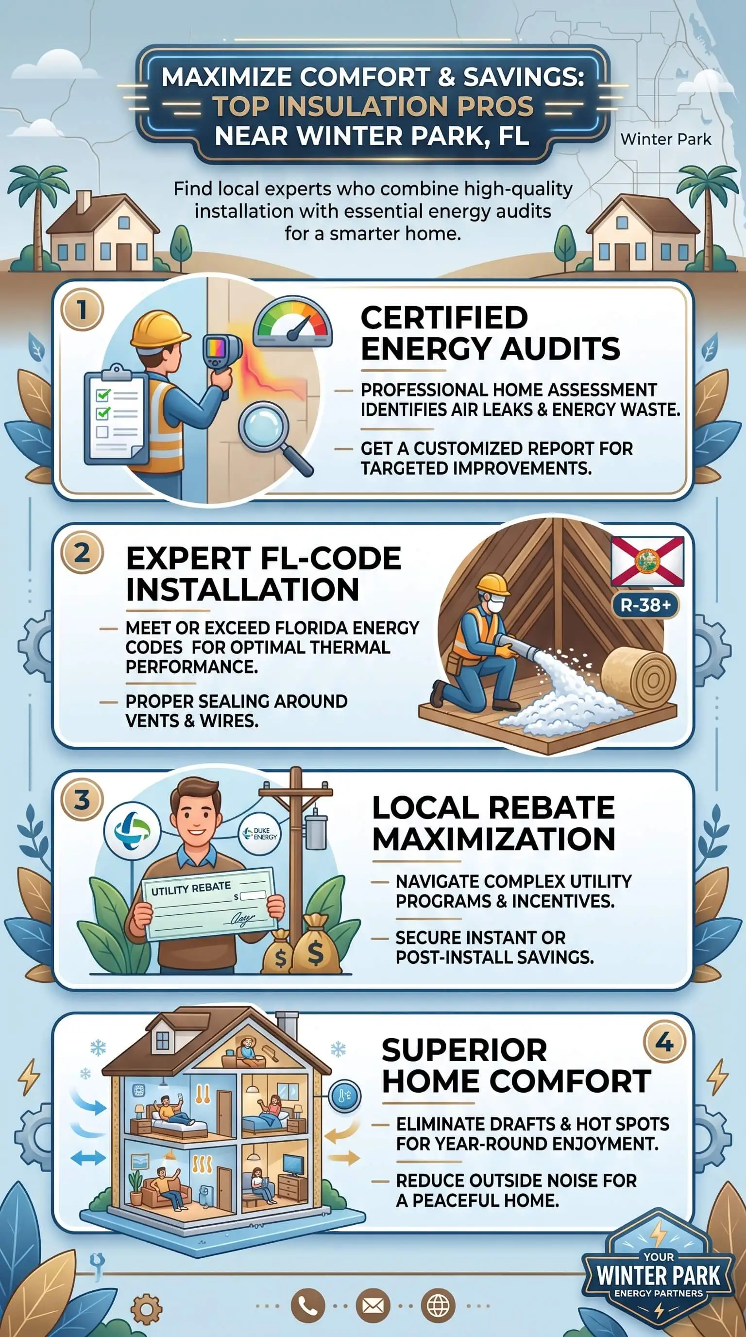 In homes we’ve assessed across Orange County, insulation installation in Winter Park, FL addresses that root cause consistently. Homeowners who make the upgrade see measurable comfort changes in their first full cooling season, along with utility bill reductions that reflect a genuine improvement in how the home holds temperature.